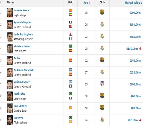 西甲球员最新身价:亚马尔2亿欧居首,,维尼修斯跌至1.5亿欧
