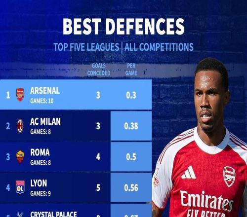 五大联赛球队各项赛事场均丢球榜:枪手0.3球最少,米兰第二